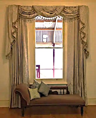 We do a lot of curtains for heritage houses and museums. Below is an example of our curtains, from Hoover House in Leonora, which we designed to compliment the design of the room, and the relevant era.
